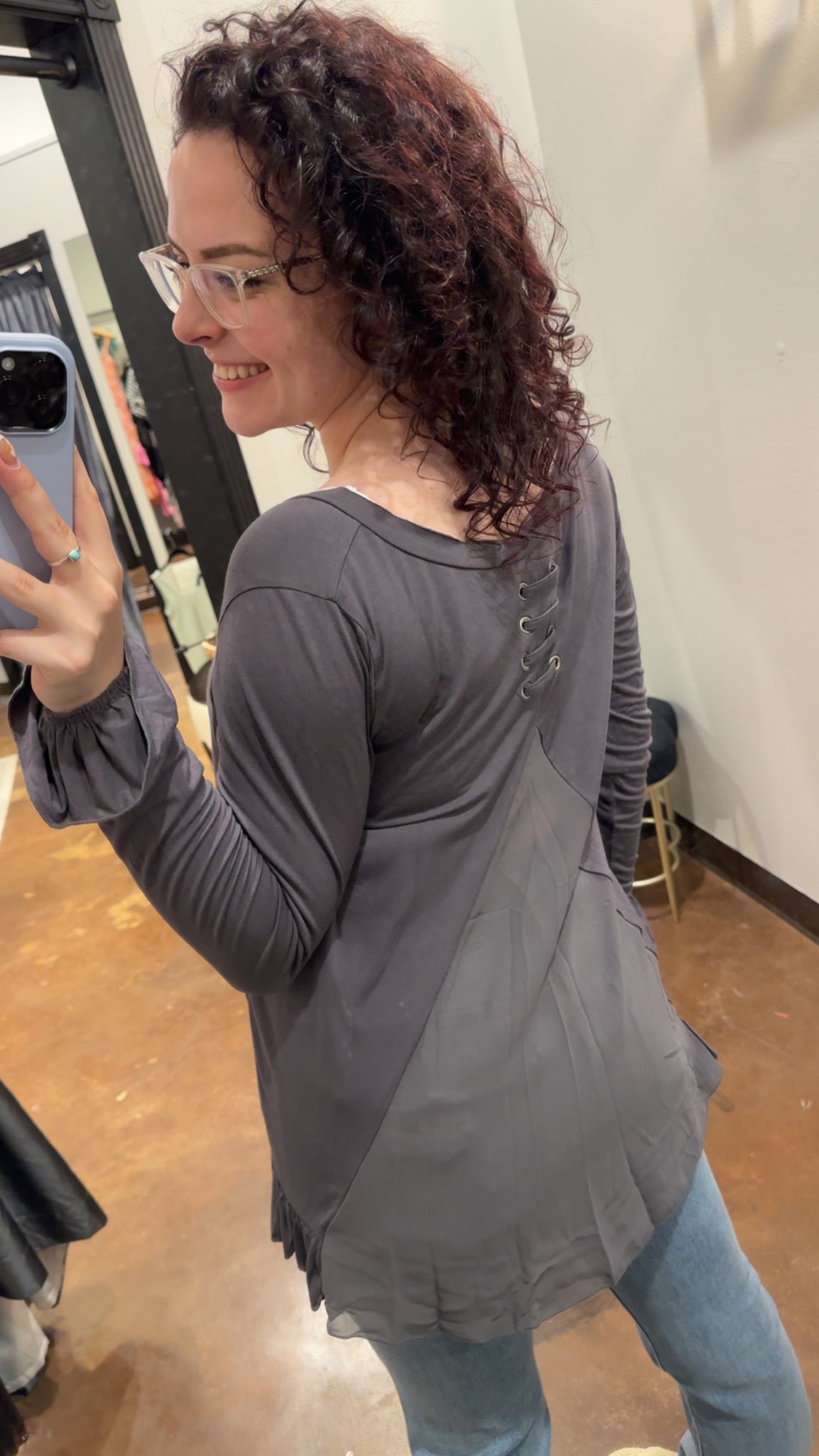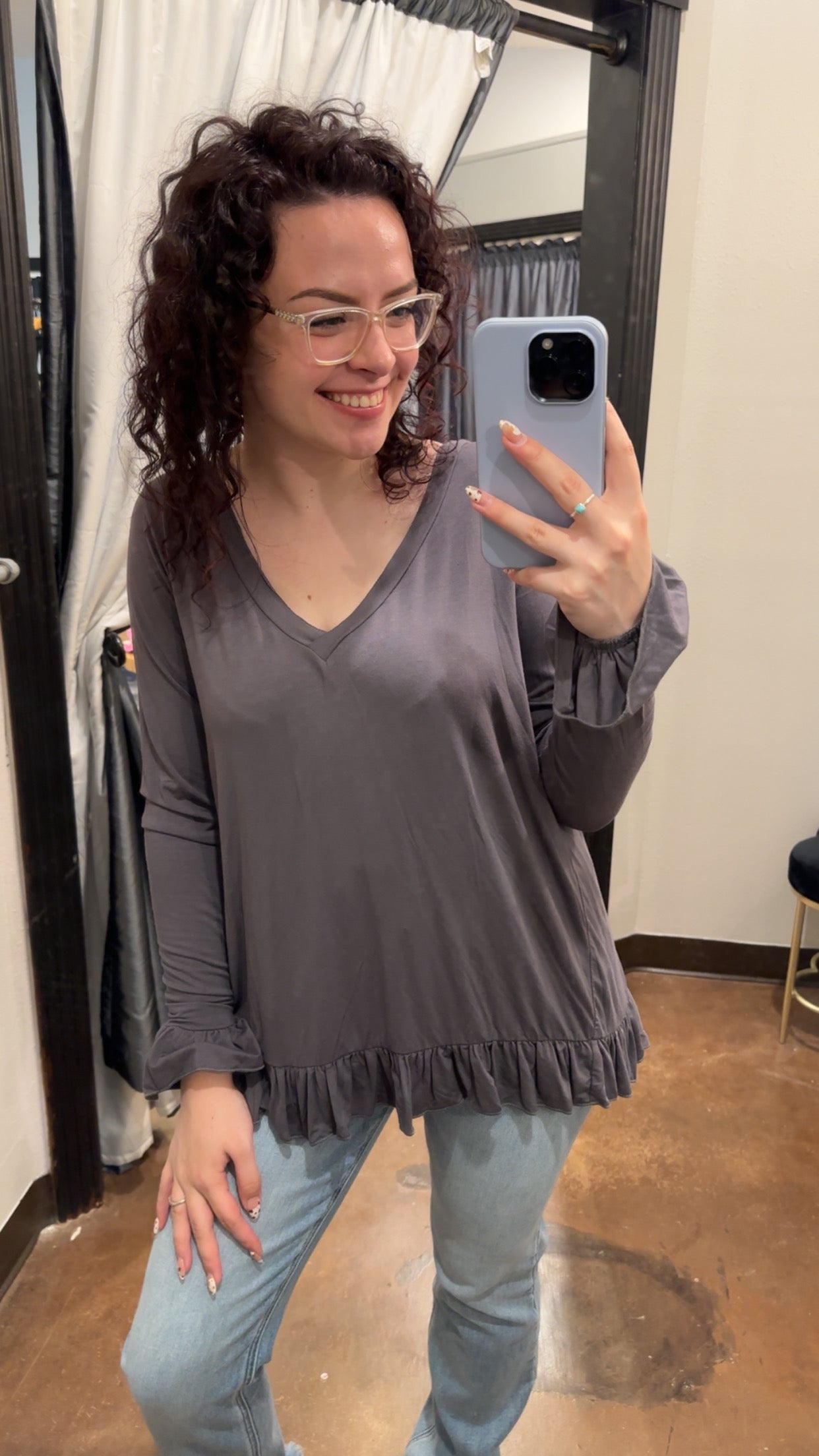 A delicate blend of softness and sophistication, our Long Sleeve V-Neck Top With Ruffle Hem brings effortless charm to any wardrobe. Designed with a flattering v-neckline and romantic ruffle accents at the wrists and hem, it adds a gentle, feminine movement to your every step. The unexpected detail, a semi-sheer triangular back panel, offers a modern twist, creating visual interest and just the right hint of allure.