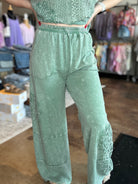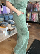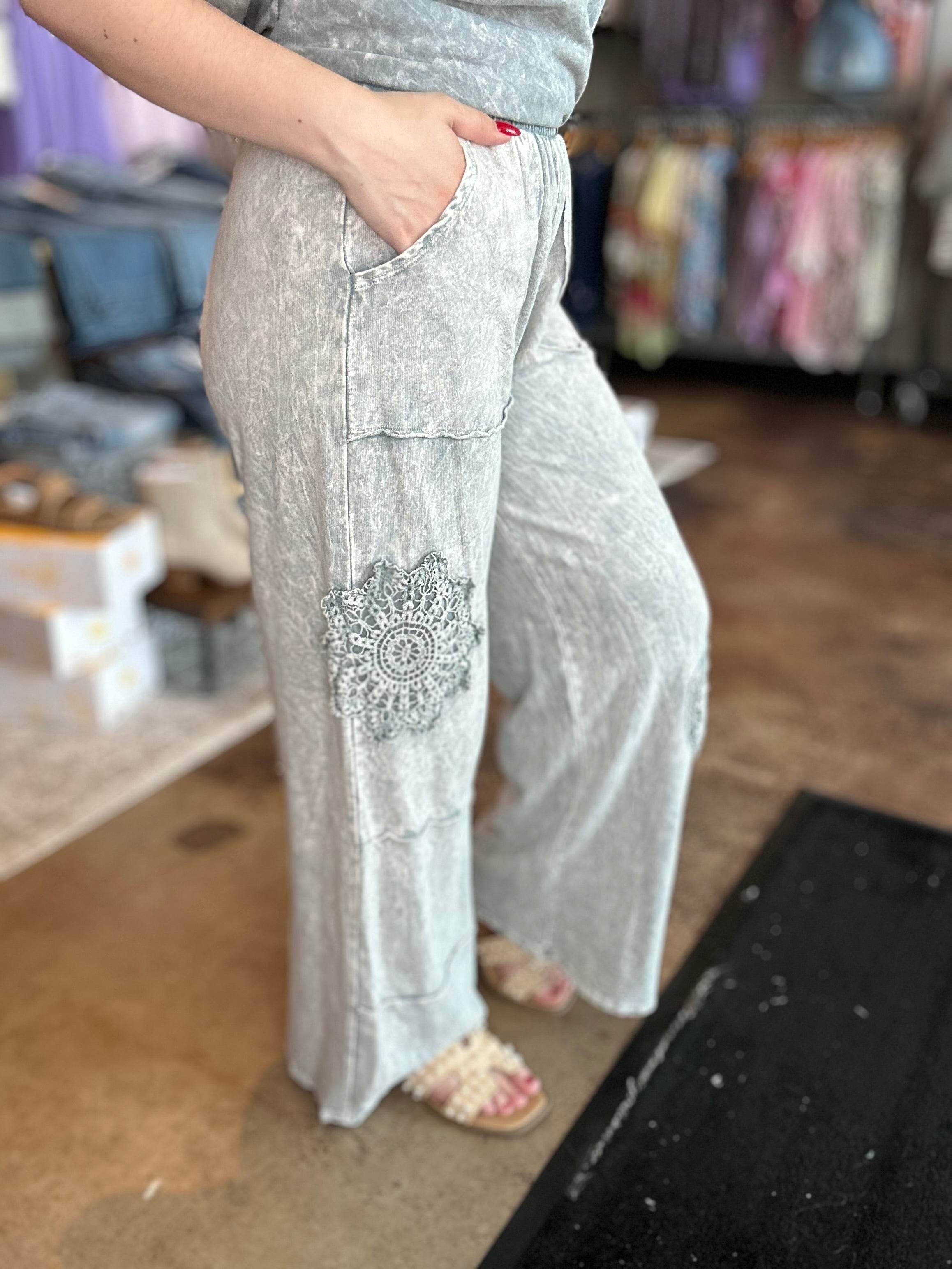 Our Mineral Washed Doily Detail Wide Leg Pants pair vintage‑faded softness with artisan charm, featuring a relaxed yet structured silhouette in a softly mineral‑washed fabric. The wide straight-leg drape offers a flattering flow while the generous elastic waistband ensures easy pull-on comfort and customizable fit. Doily motifs add subtle boho romance and textured visual interest without sacrificing the relaxed ease of wear. Deep front pockets enhance the casual utility and laid‑back vibe.