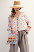 Effortlessly chic and uniquely bold — our Mixed Print Button Down Top blends multiple prints with feminine sophistication. The V‑neckline frames your collar beautifully, while the relaxed and loose silhouette drapes softly for all‑day comfort. Tailor the look your way: wear it open over a tank or buttoned up for an elegant breezy statement. Perfect for work, weekends, and warm‑weather layering alike.