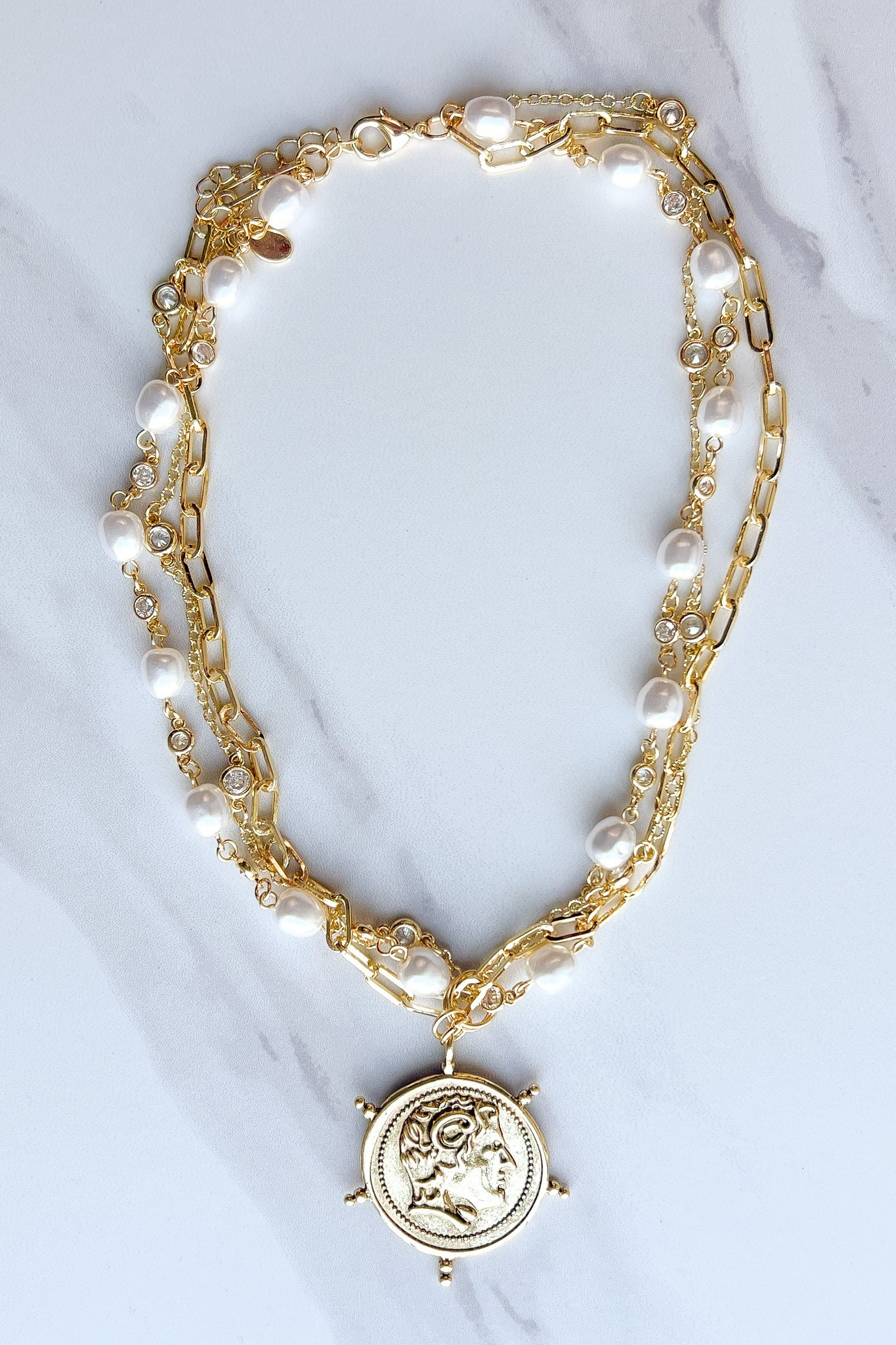 One layer features a pearl/rhinestone gem combo connected with dainty gold chains.
