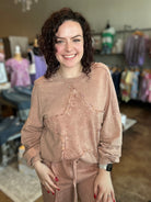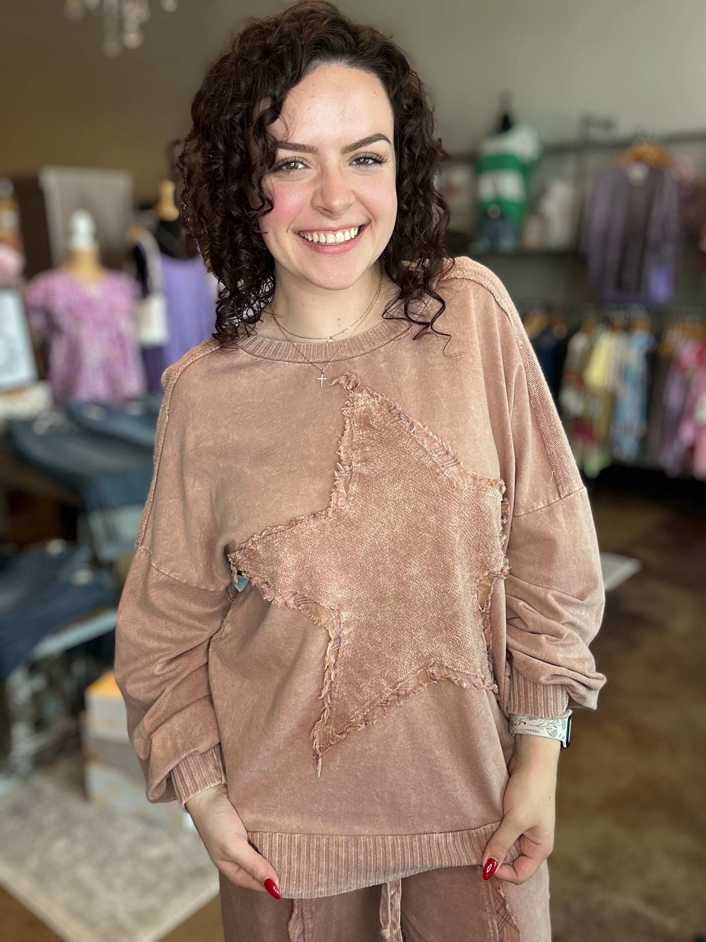 Our Plaid Star Sweatshirt brings effortless edge to relaxed styling, softened by mineral-wash that offers a cool, lived-in look. A bold star outlined in plaid adds modern graphic appeal, playing boldly against the washed backdrop. A subtle drop shoulder and balloon sleeves enhance ease and shape, while side slits at the hem add a gentle swing to the silhouette and enhance layering versatility. With a crew neckline and relaxed fit, it pairs seamlessly with jeans, biker leggings, or casual skirts—offering wearable comfort with a quietly stylish statement.