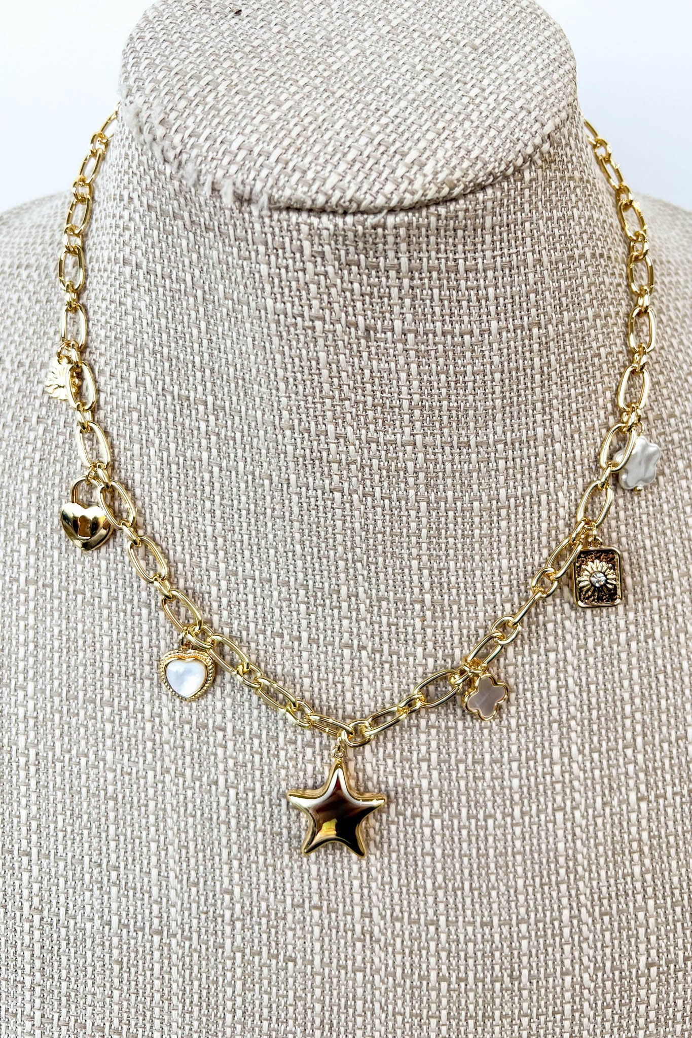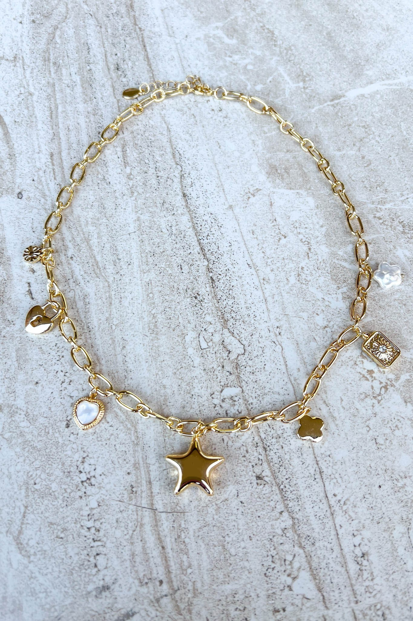 1 layer necklace featuring a gold chain link with a variety of fun charms throughout, including a puffy star charm as the center charm.