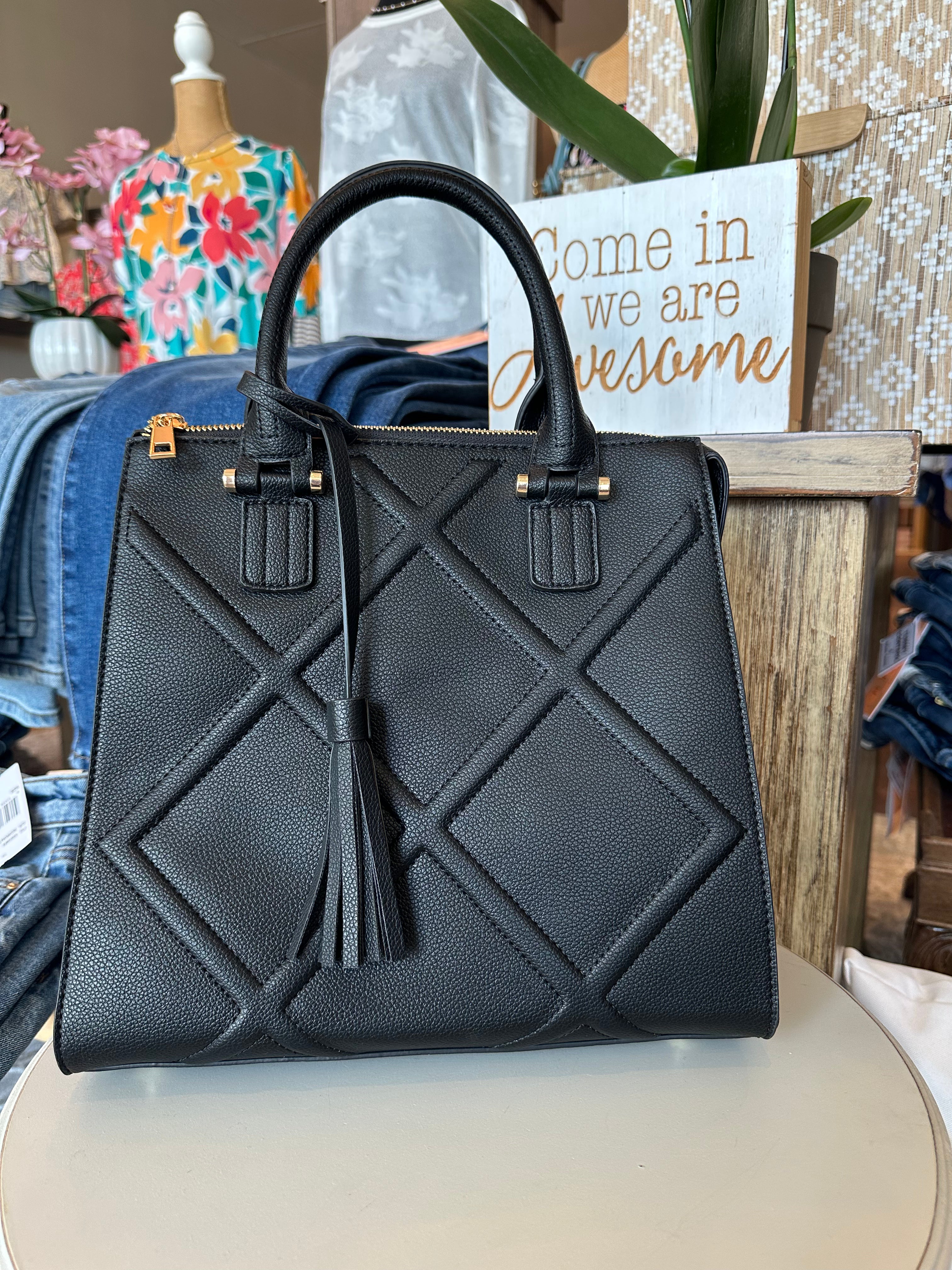 Elevate your everyday with our Raised Stitch Fringe Satchel, where artisanal craftsmanship meets playful charm. The exterior showcases artfully raised stitching that adds depth and texture, giving this bag a refined, handcrafted feel. A flowing fringe tassel swings from the side, bringing a touch of movement that’s effortlessly chic and fun. The structured silhouette and top handle create a polished look, while a detachable crossbody strap keeps it versatile and hands-free for on-the-go days. Inside, you’ll find a neatly lined interior with pockets to keep your essentials organized. With its sculptural stitching and lively tassel accent, this satchel pairs seamlessly with casual outfits or office-ready ensembles — a true style statement with substance.
