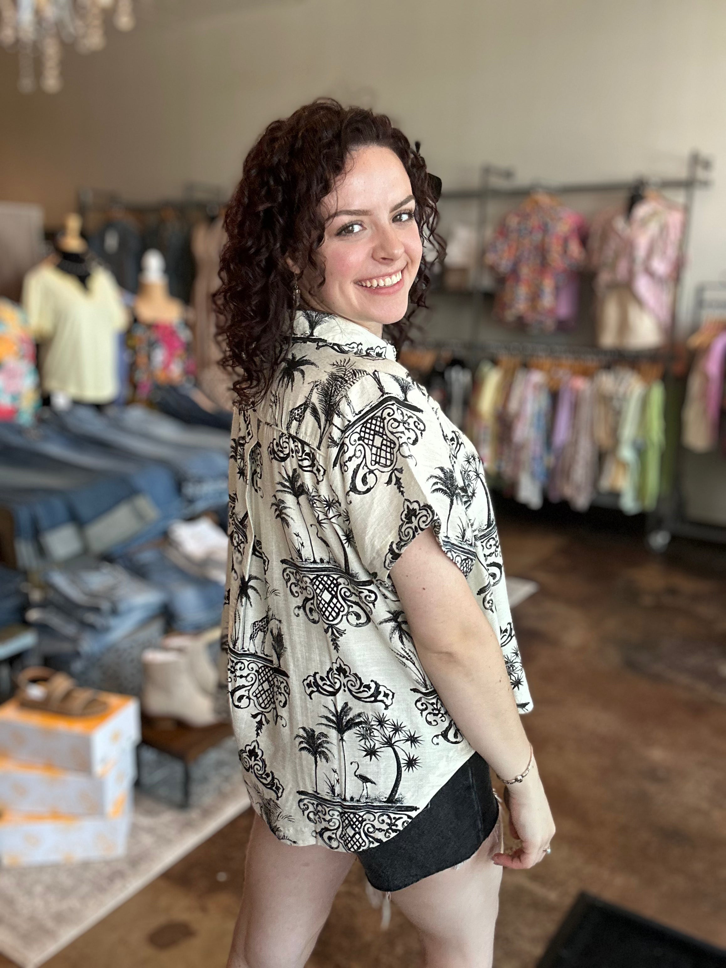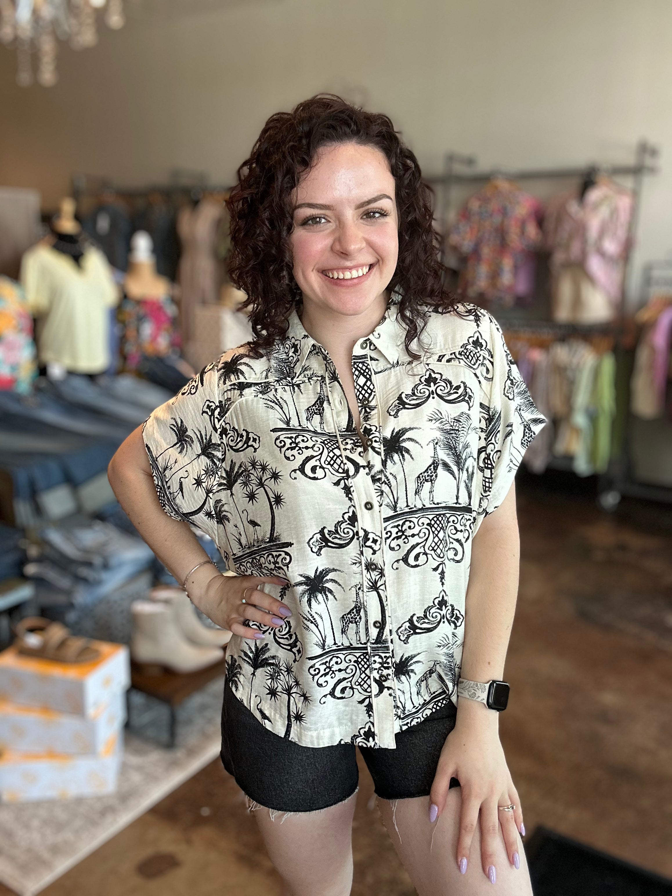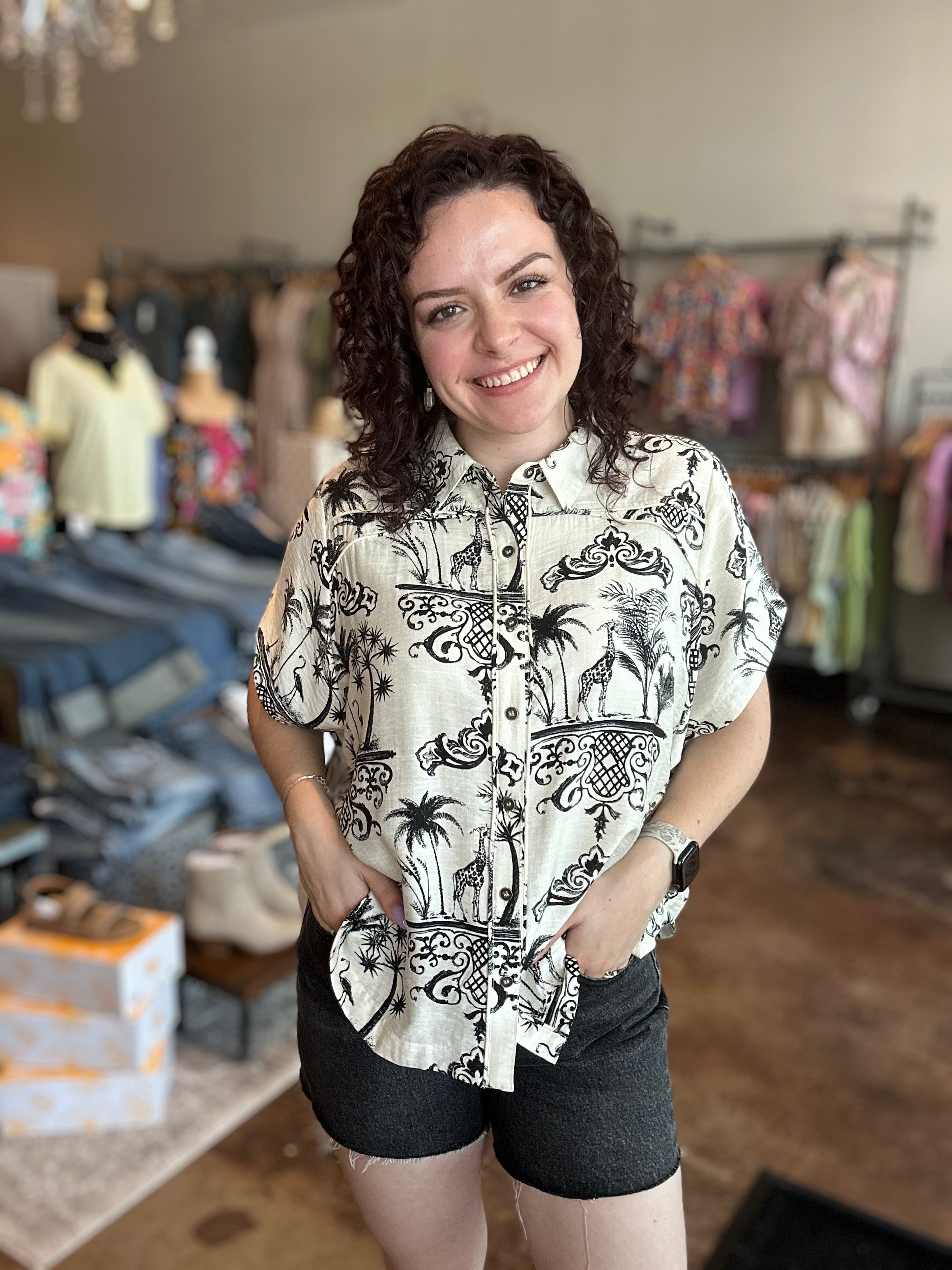 Embrace a bold yet refined look with this Relaxed Fit Button-Down Shirt in a captivating black and ivory color and safari print. This shirt effortlessly blends classic tailoring with adventurous spirit, featuring a relaxed silhouette that drapes gracefully over the body. The intricate safari-inspired print adds a touch of exotic flair, making it a standout piece in your wardrobe.