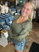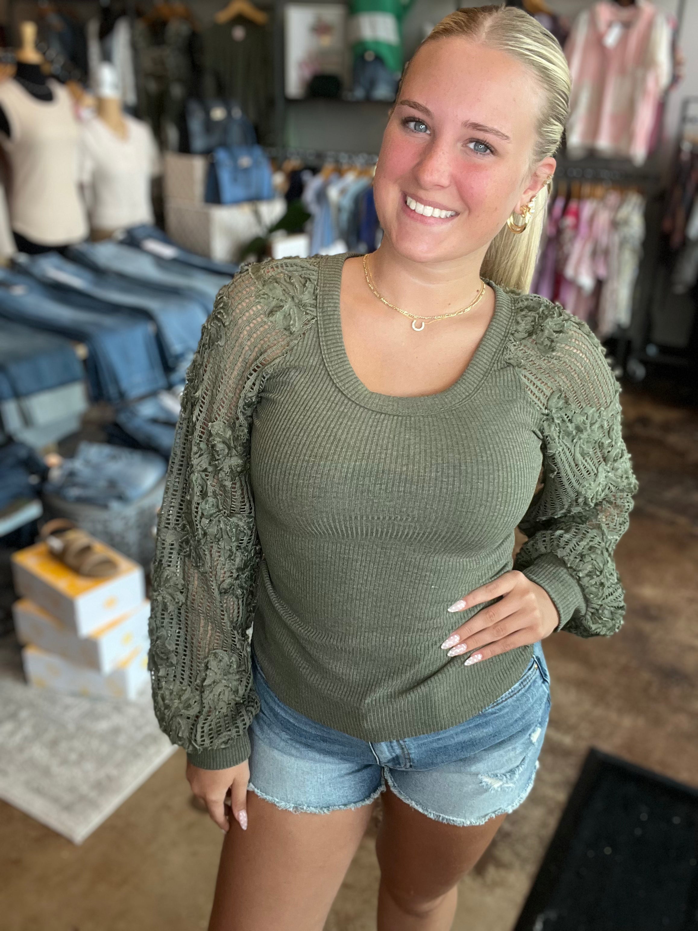 Crafted from a soft and stretchy ribbed knit blend, our Ribbed Knit Top With Lace Balloon Sleeves delivers a form-fitting, figure-enhancing silhouette with all-day comfort. It features dramatic long balloon sleeves in floral lace, adding feminine volume and visual interest. The classic round neckline and versatile below-waist length make it effortless to style—tuck it into high-waisted jeans for a casual daytime look or pair it with a skirt and heels for an elegant evening ensemble.