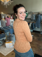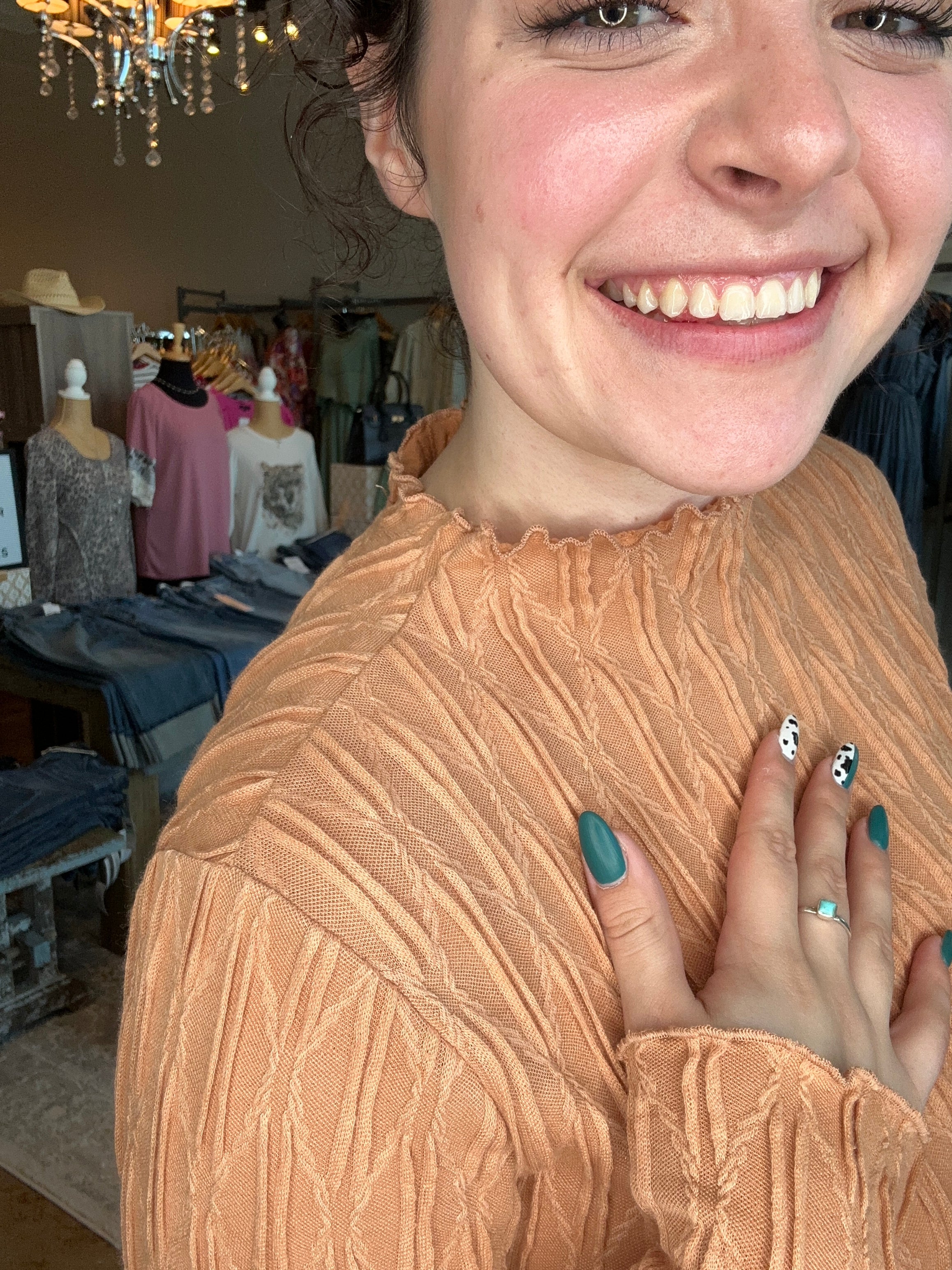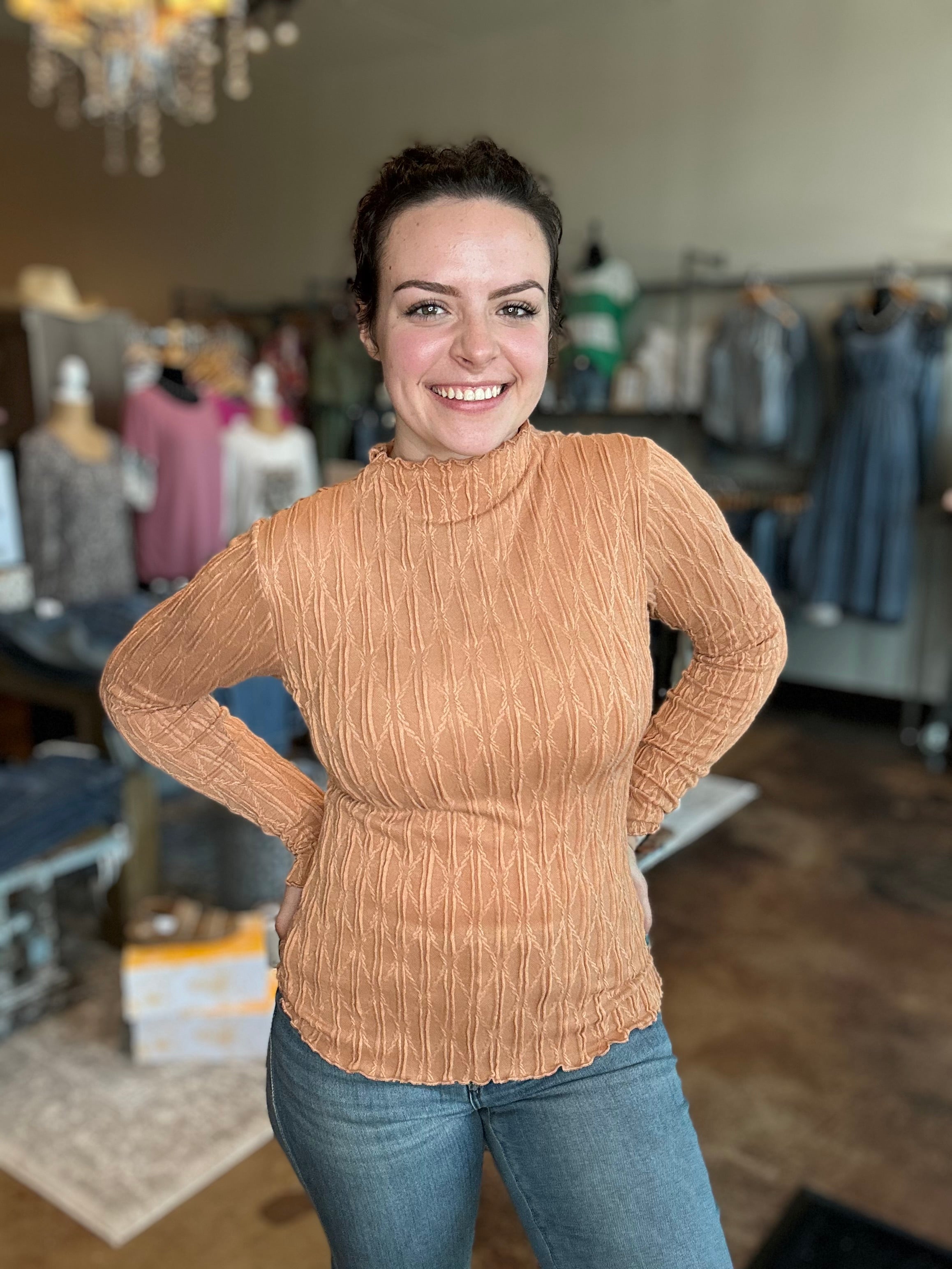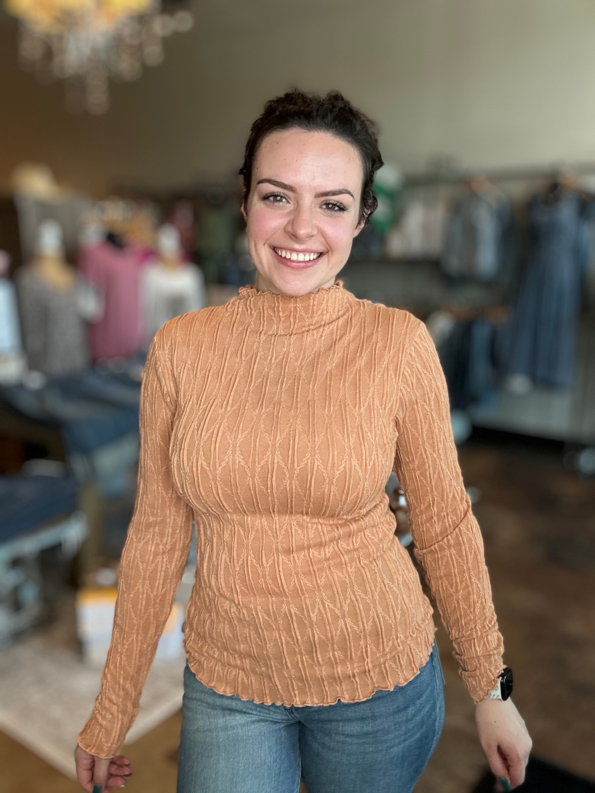 Soft, sleek, and subtly detailed — our Ruched Mock Neck Textured Top is a closet essential with a modern twist. Featuring a stretch ruched mock neck, long sleeves, and a flattering fitted silhouette, it’s perfect for layering or wearing solo. The delicate lettuce-edge texture adds a feminine finish to this cozy-chic staple.