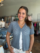 Slip into laid-back elegance with our Short Sleeve Crochet Knit Top—it’s the perfect blend of breezy comfort and playful polish. The delicate open-knit fabric and effortless button-down front give it that “just relaxed enough” charm. The best part? The beautiful flower shaped buttons! Wear it buttoned for a refined, lightweight layer or open over a tank or sundress for instant boho flair.