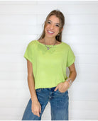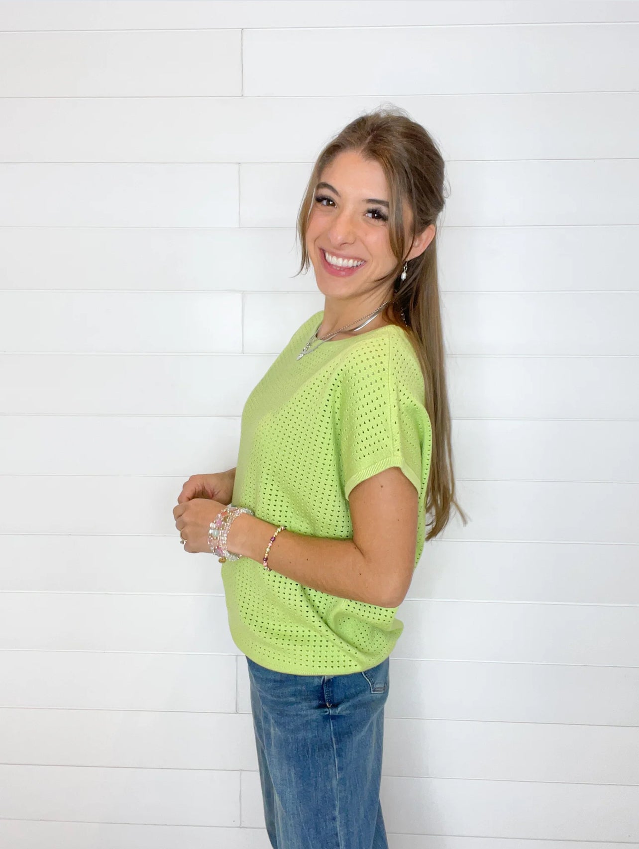 This short sleeve eyelet knit top is expertly crafted from the finest materials, ensuring both comfort and durability. The delicate eyelet knit detailing adds a touch of sophistication, making it perfect for any occasion. Upgrade your wardrobe with this versatile and stylish top.