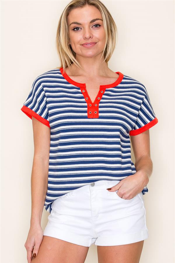 Expertly crafted thermal stripe top featuring a distinctive split eyelet neckline with color trim detailing. The short sleeve design offers versatility for transitional weather, while the thermal fabric provides lightweight warmth and breathability. Perfect for layering or wearing alone for a refined casual look.