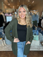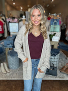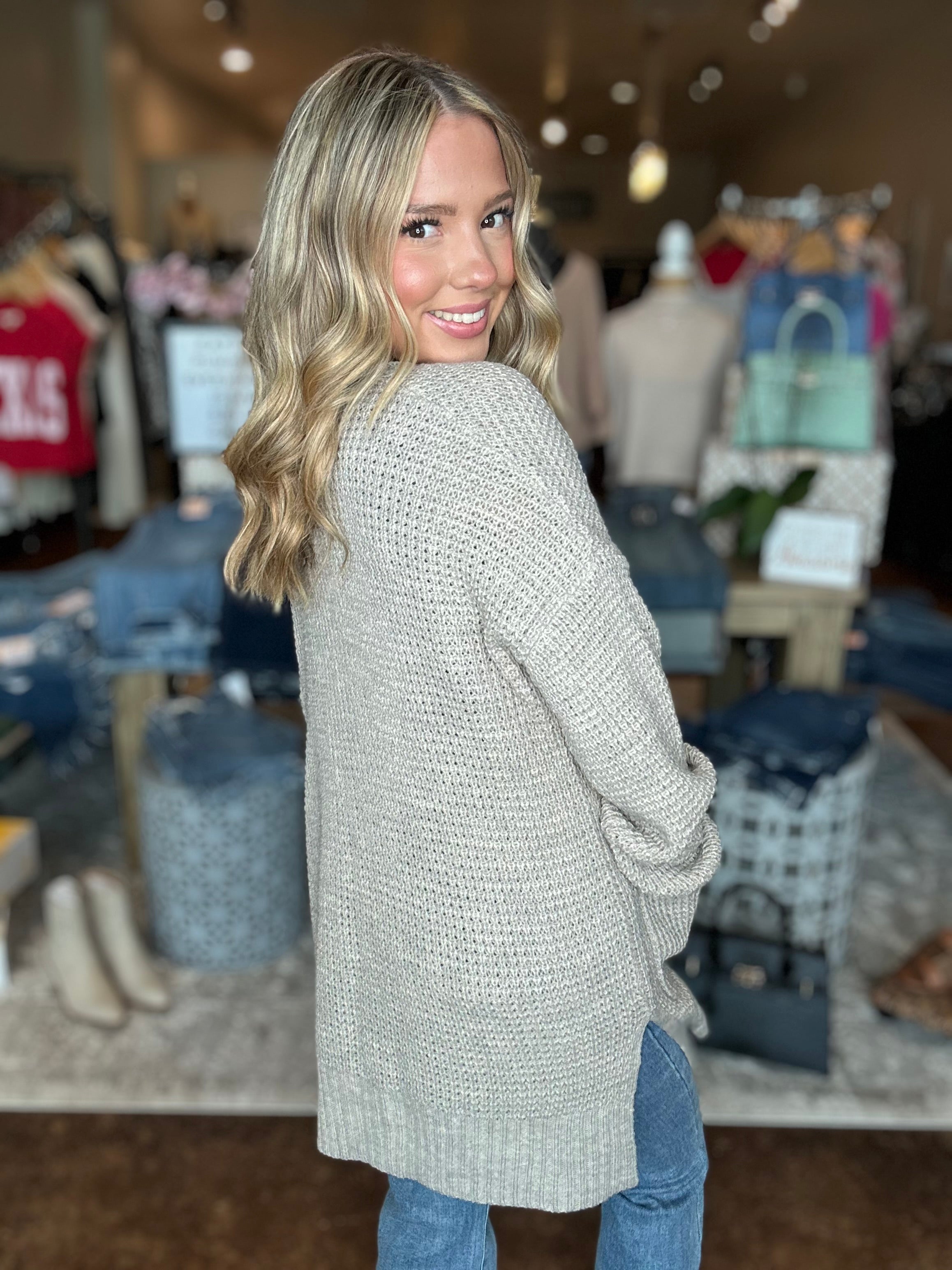 Wrap yourself in cozy comfort with our Waffle Knit Cardigan. Featuring a relaxed fit, ribbed hem and cuffs, and convenient front pockets, this layering essential is perfect for chilly mornings, coffee runs, or lounging in style. The textured waffle knit adds a touch of dimension while keeping things effortlessly casual and chic. Throw it over a basic tee and jeans or layer it with leggings for that cozy, go-anywhere look.