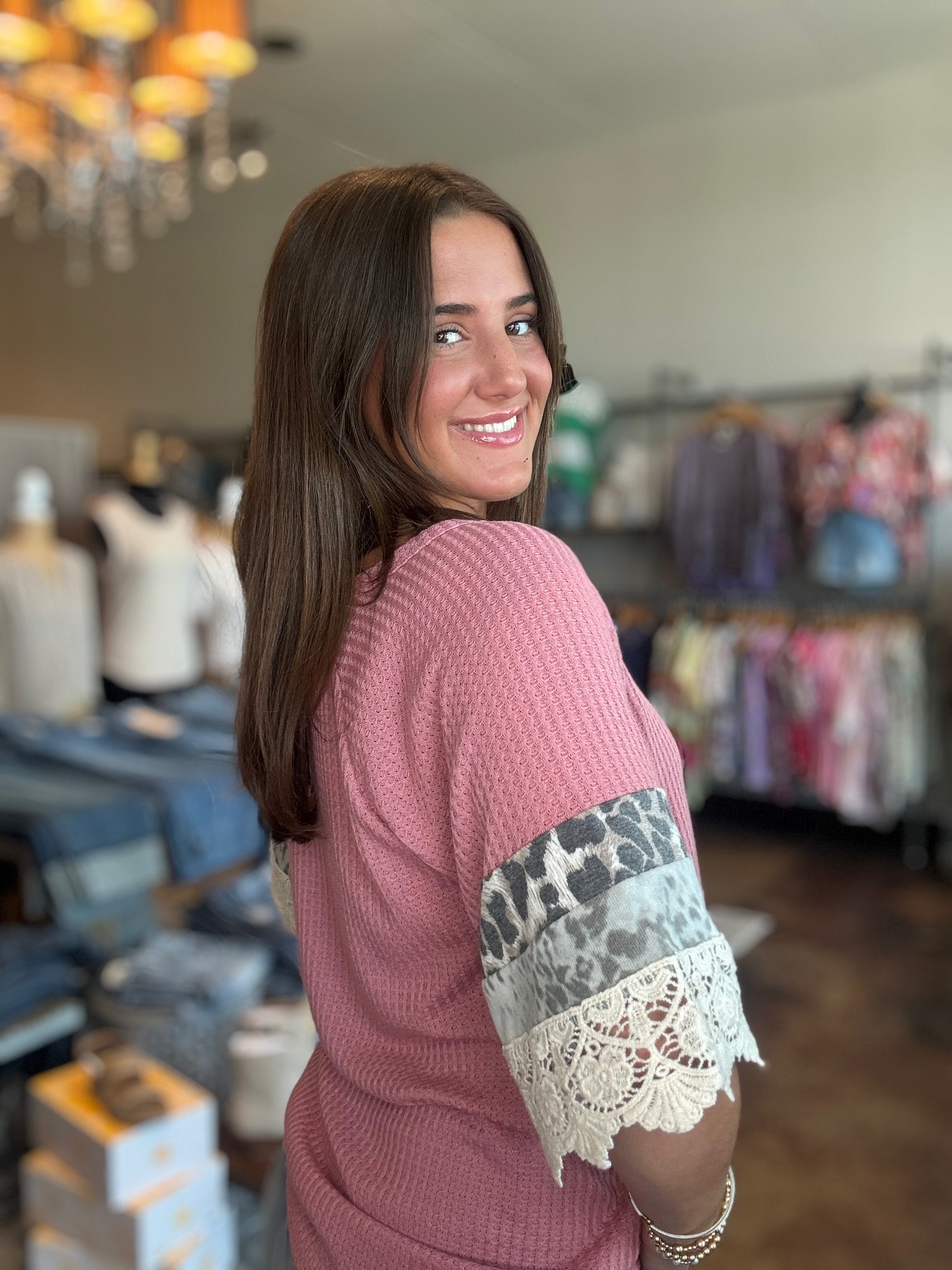 Bold meets boho in this statement-making Waffle Knit Leopard Blocking Top with Crochet Lace Sleeve. Designed for the woman who loves texture and contrast, this top features a soft waffle-knit base with eye-catching leopard print color blocking for a modern, edgy twist.
