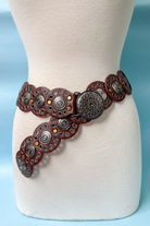 Western-inspired belt, with round discs, metal studs, and coin buckle. Each disc has a diameter of 2.5"